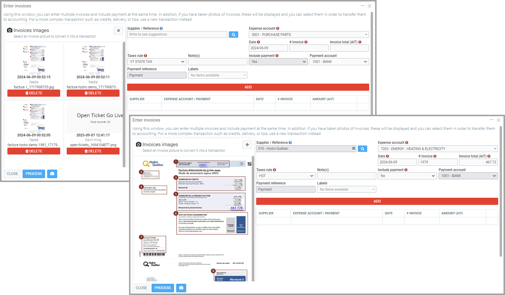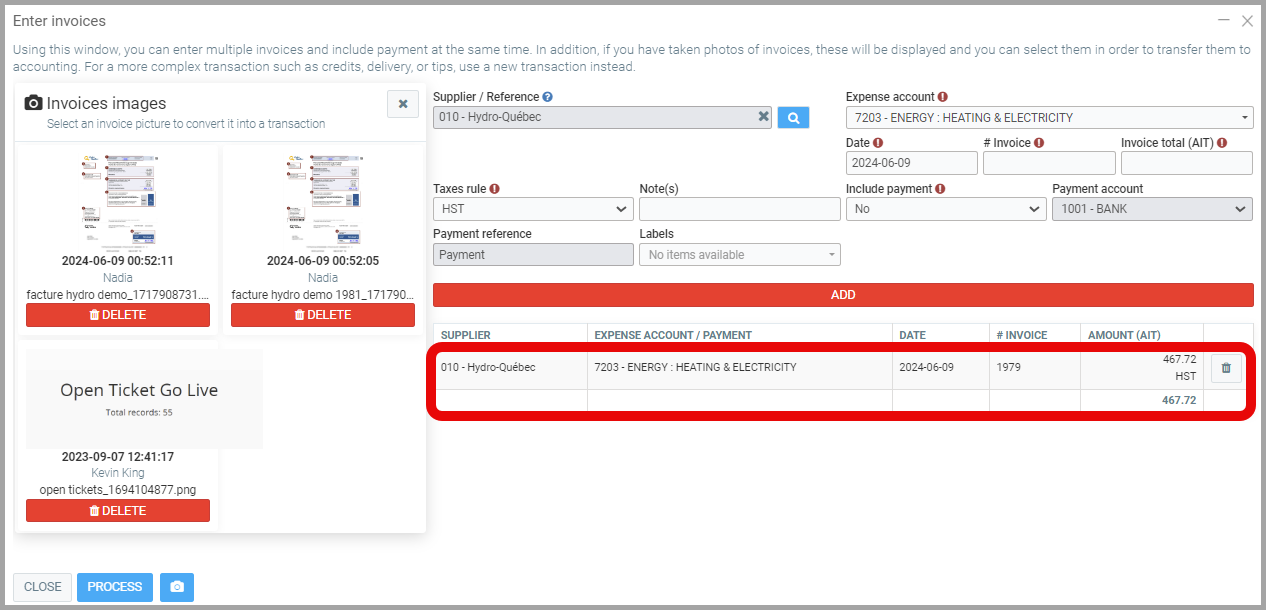 Click on Add to save the invoice. The corresponding photo will be removed from the pending list and a line will be added below the Add button referring to the invoice you just entered.