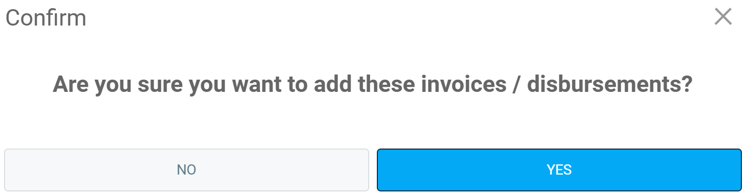 A confirmation window appears with the message “Are you sure you want to add these invoices/disbursements?”.