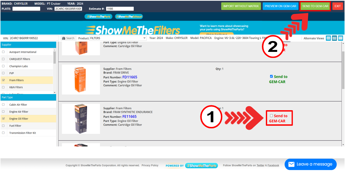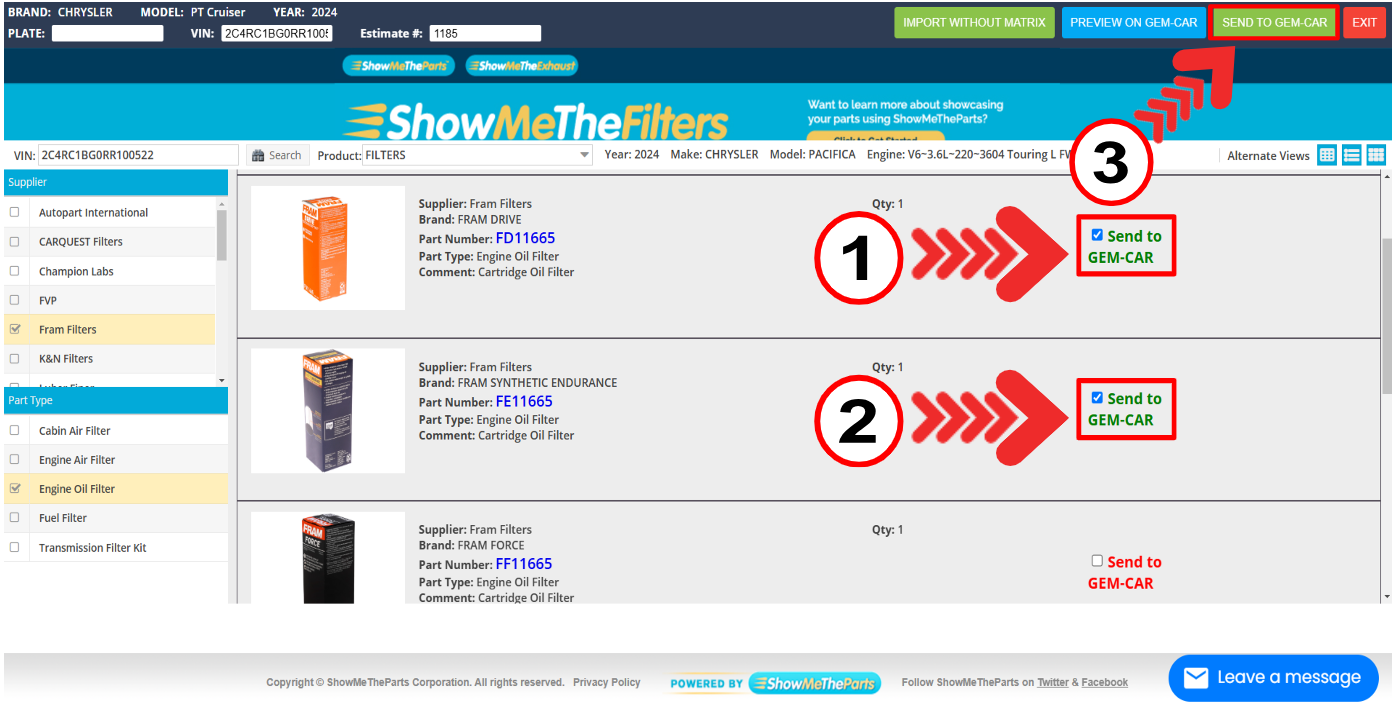 In the Fram Filters tab, check the boxes of the products you wish to Send to GEM-CAR.