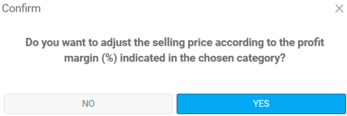 A dialog box opens with the following message: “Do you want to adjust the selling price according to the profit margin (%) indicated in the chosen category?”