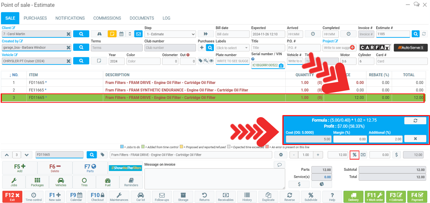 In the Point of Sale, enter the client, click on ShowMeTheFilters, between F7 Part(s) and Message on invoice.