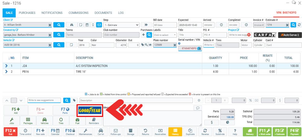 Before completing or invoice the transaction with your client, click on the Goodyear icon.