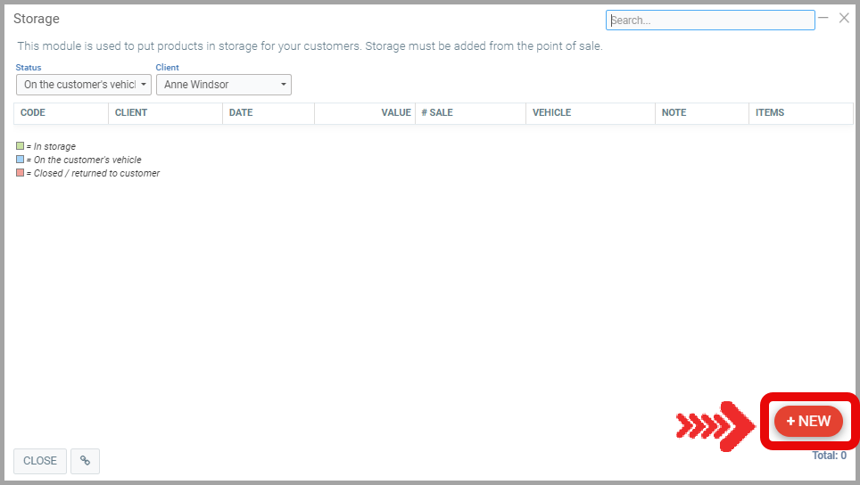 From the left main Menu, click on Vehicles > Storage.
