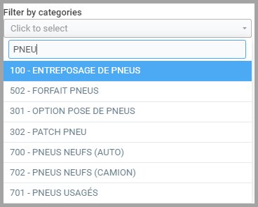 For a more comprehensive report, choose to Filter by categories. In Filter by categories, select the categories for which you want to obtain the sales summary in the report. We suggest selecting all categories, whether services or products, related to tires. We selected Tire Storage, Tire Package, Installation Option, New Tires (car and truck), etc. You can select more than one category.