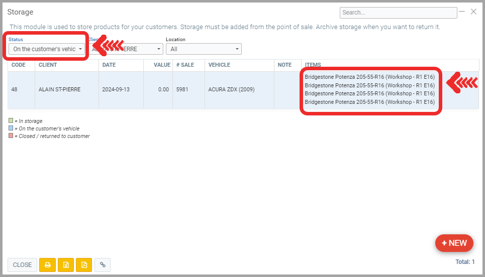 There, you will find the tires stored for the customer and the vehicle selected at the Point of Sale.