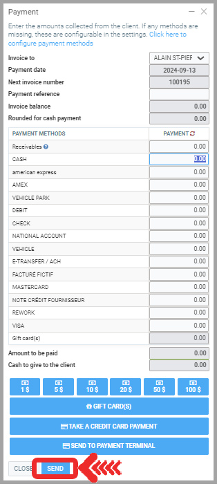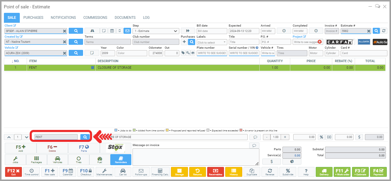 To remove tires from the list of available tires for storage, from the Point of Sale, enter the product code FENT. This is the default product code configured for closing a tire storage. Then press the Enter key.