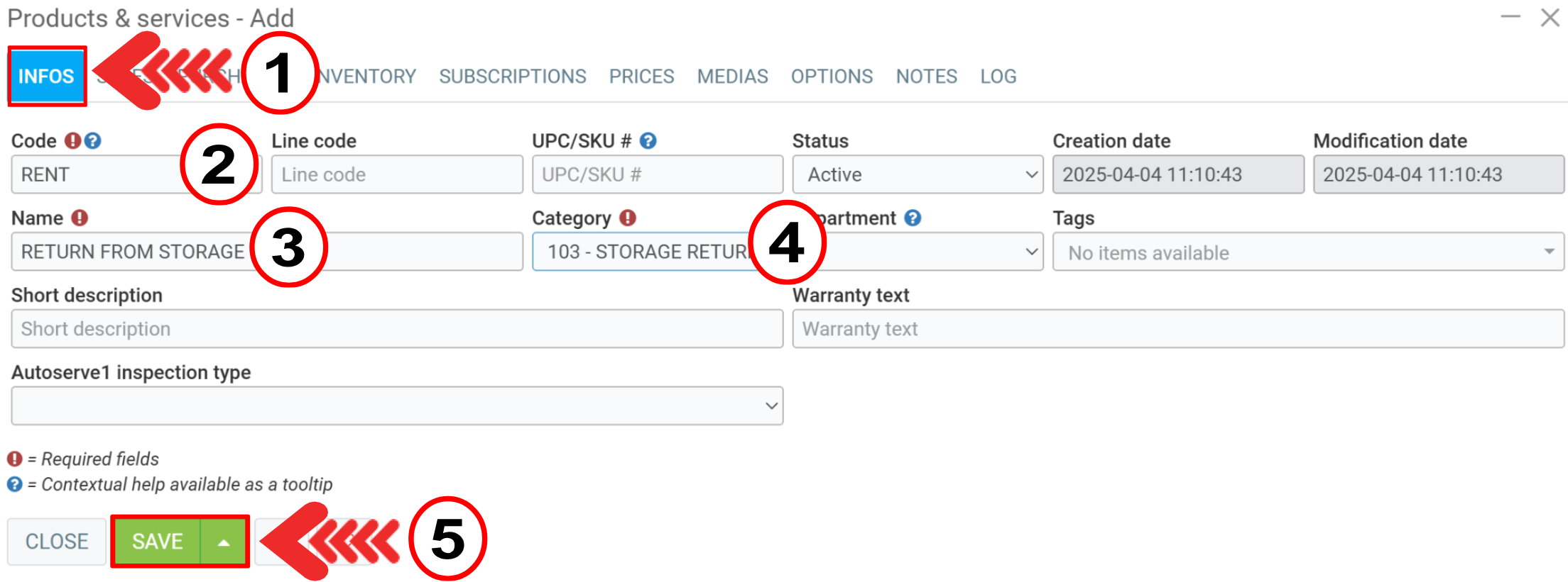 Create a new product with the Code RENT and the Name Return from Storage.