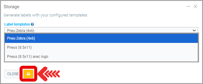 - Select the printer and format to use. For labels, choose the Zebra 4x6 Tire format as configured in your initial settings on GEM-CAR if you are using the recommended Zebra printer. Note that if you system was configured in french, the name for you labels might as well be shown in french. See Configuring Default Printers on GEM-CAR for more details.