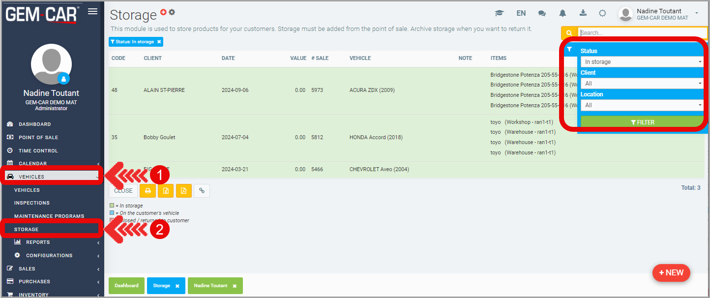 - In the main menu on the left side of the application, click on Vehicle > Storage.