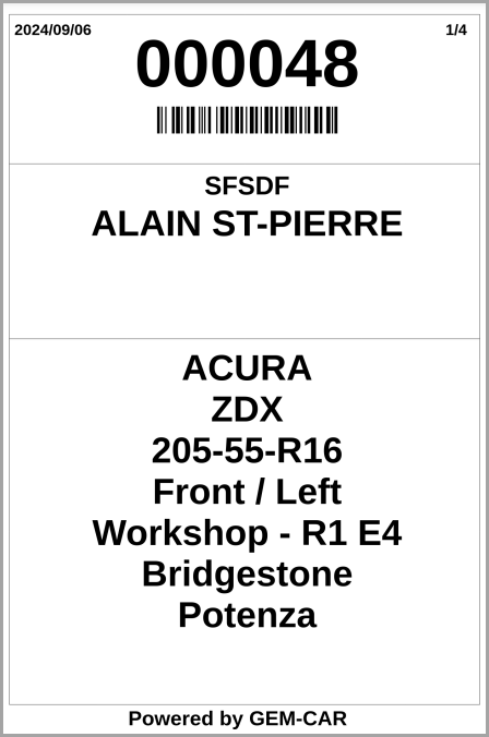 You will get 4 labels (if you stored 4 tires) containing information about the tires to be store and the relevant customer.