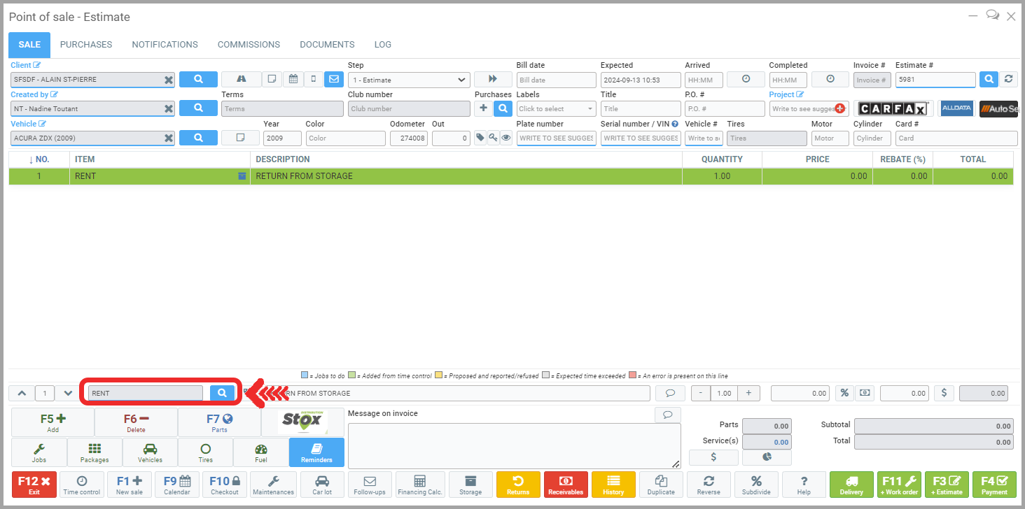 To remove a customer's tires from storage, from the Point of Sale, enter the product code RENT. This is the default product code configured for tire returns. Then press the ENTER key.