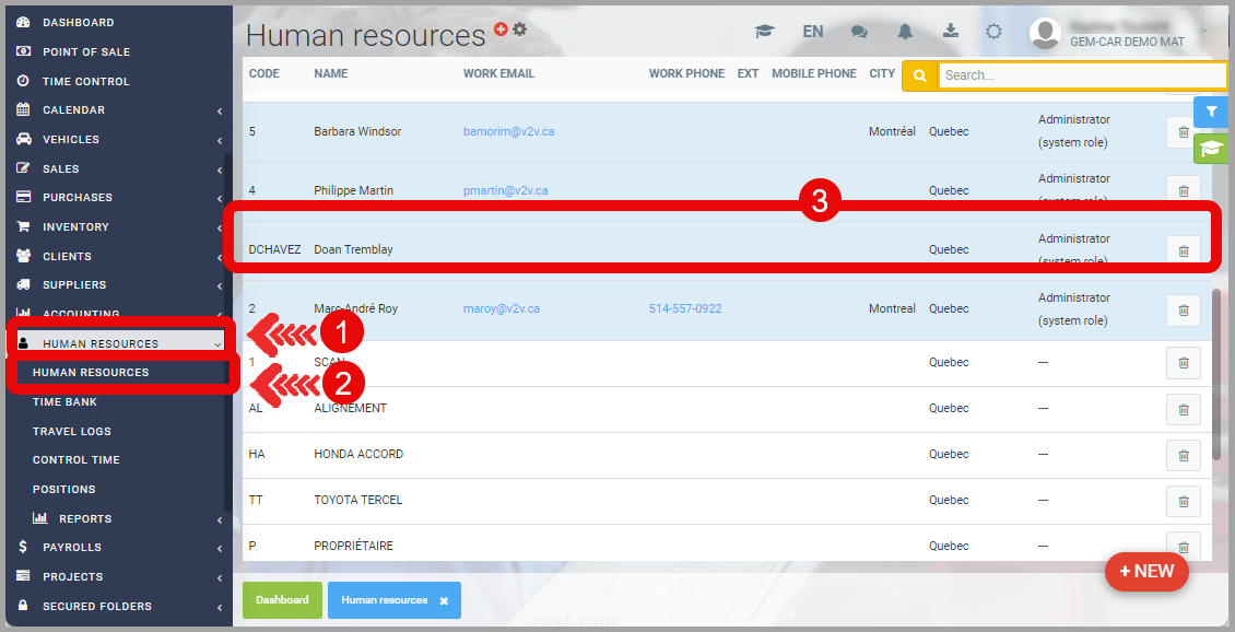 - From the main menu on the left side of the application, click on Human Resources > Human Resources.