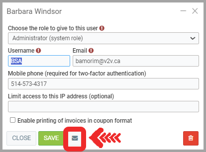 - Verify that the resource's email is valid and click on the envelope at the bottom of the window to send the password creation/reset email.