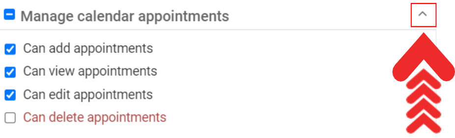 - Note that some of the rights/permissions may be grouped under a single set. Click on the arrow on the right to see the entire set of permissions.