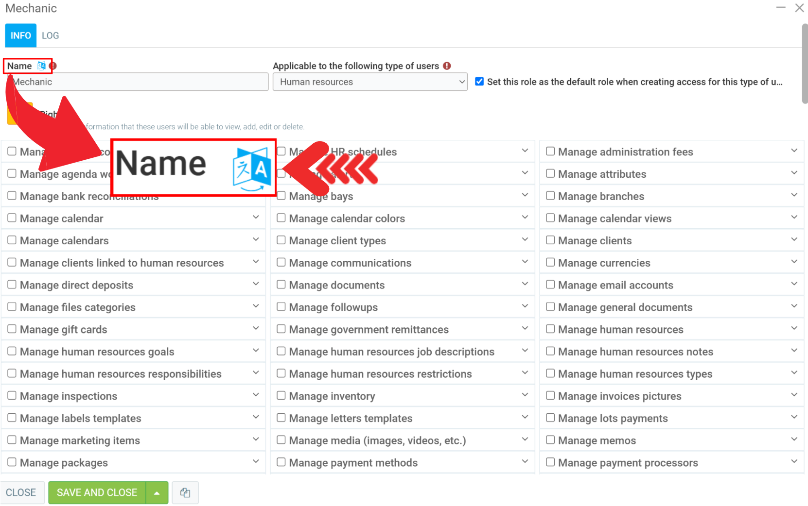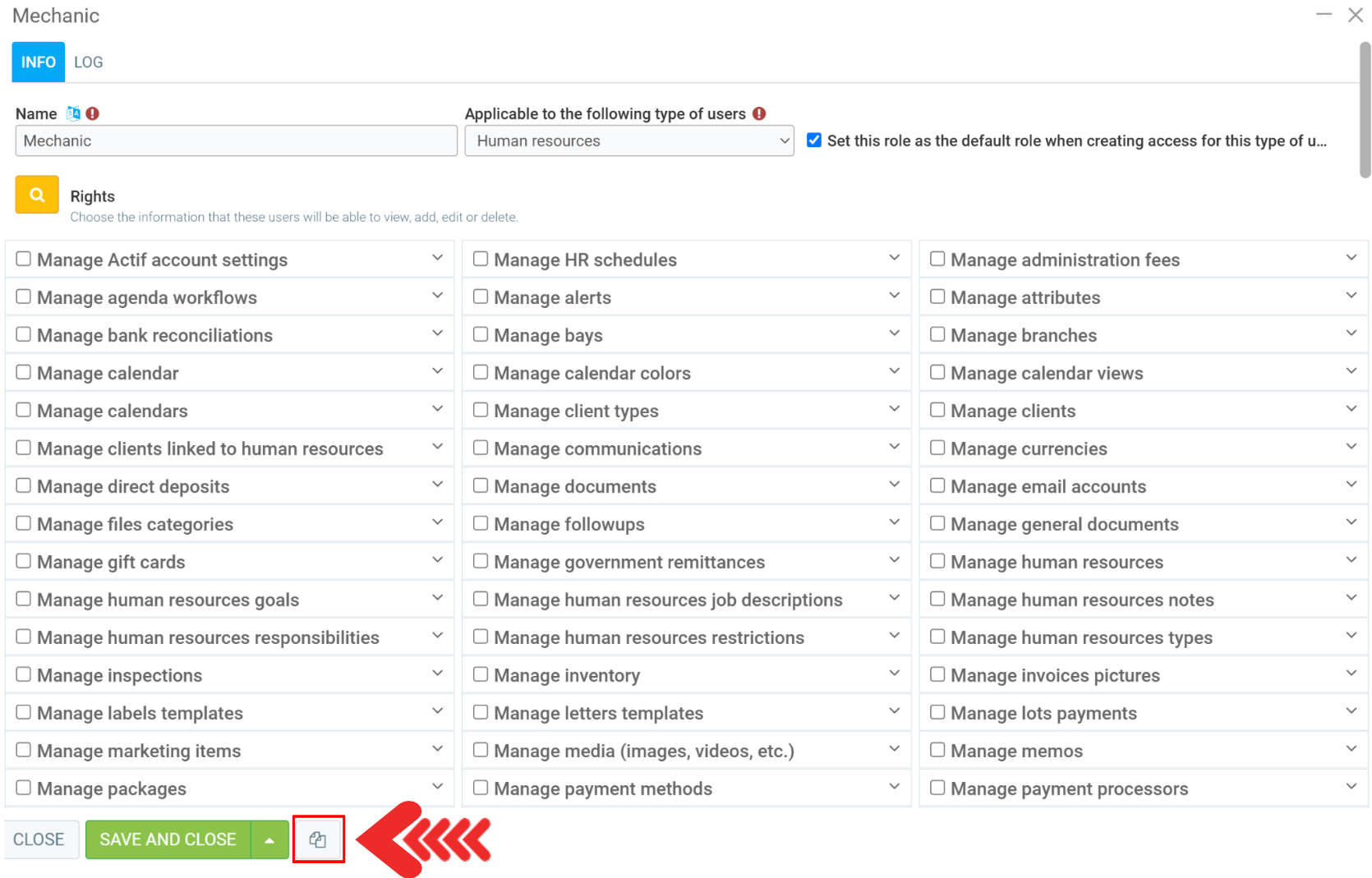 - Click on Save and close to be able to select the rights/permissions associated with the role.
