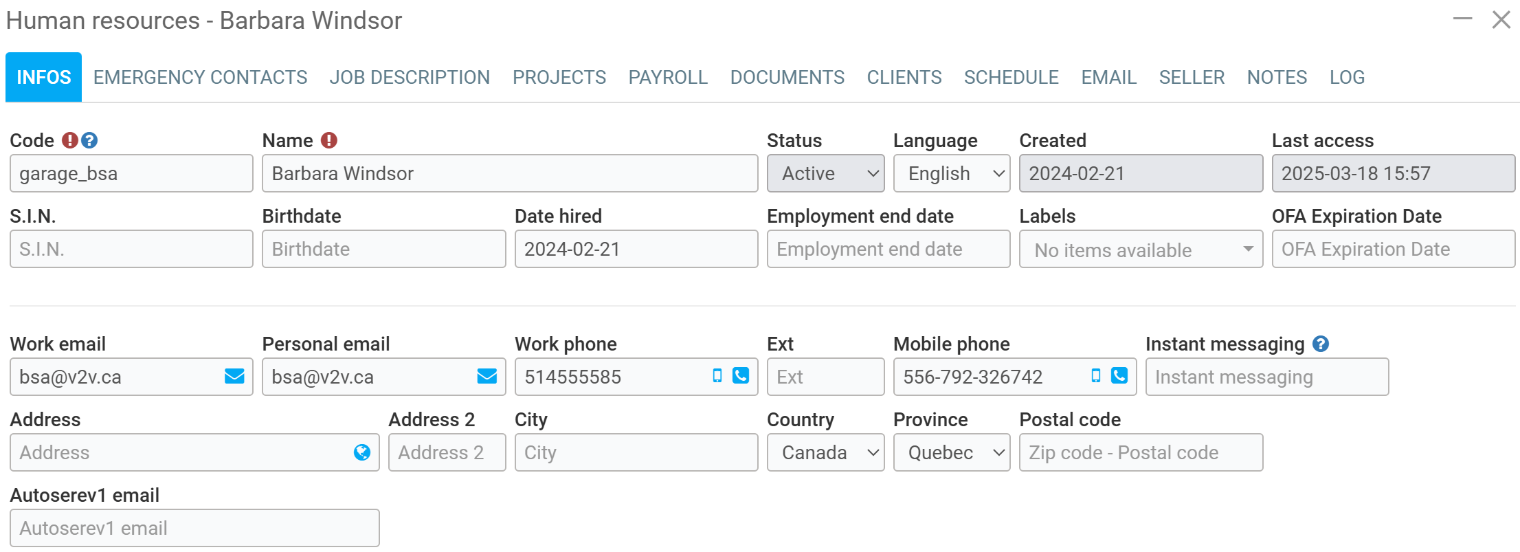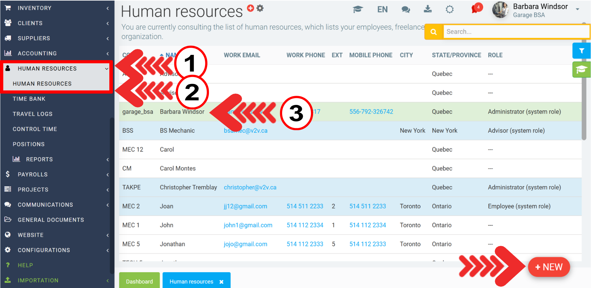 To assign or modify the role (access) given to a human resource, from the main menu located on the left side of the application, click on Human Resources > Human Resources. Select the human resource or create a new one by clicking on +New.