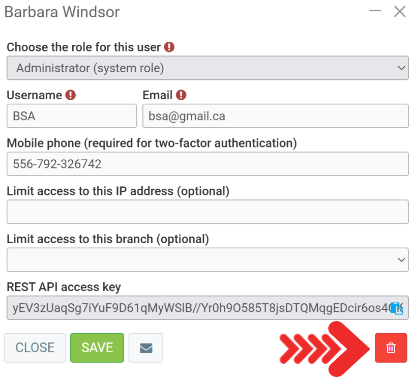 To disable a user's access, simply click on the trash icon located at the bottom right.