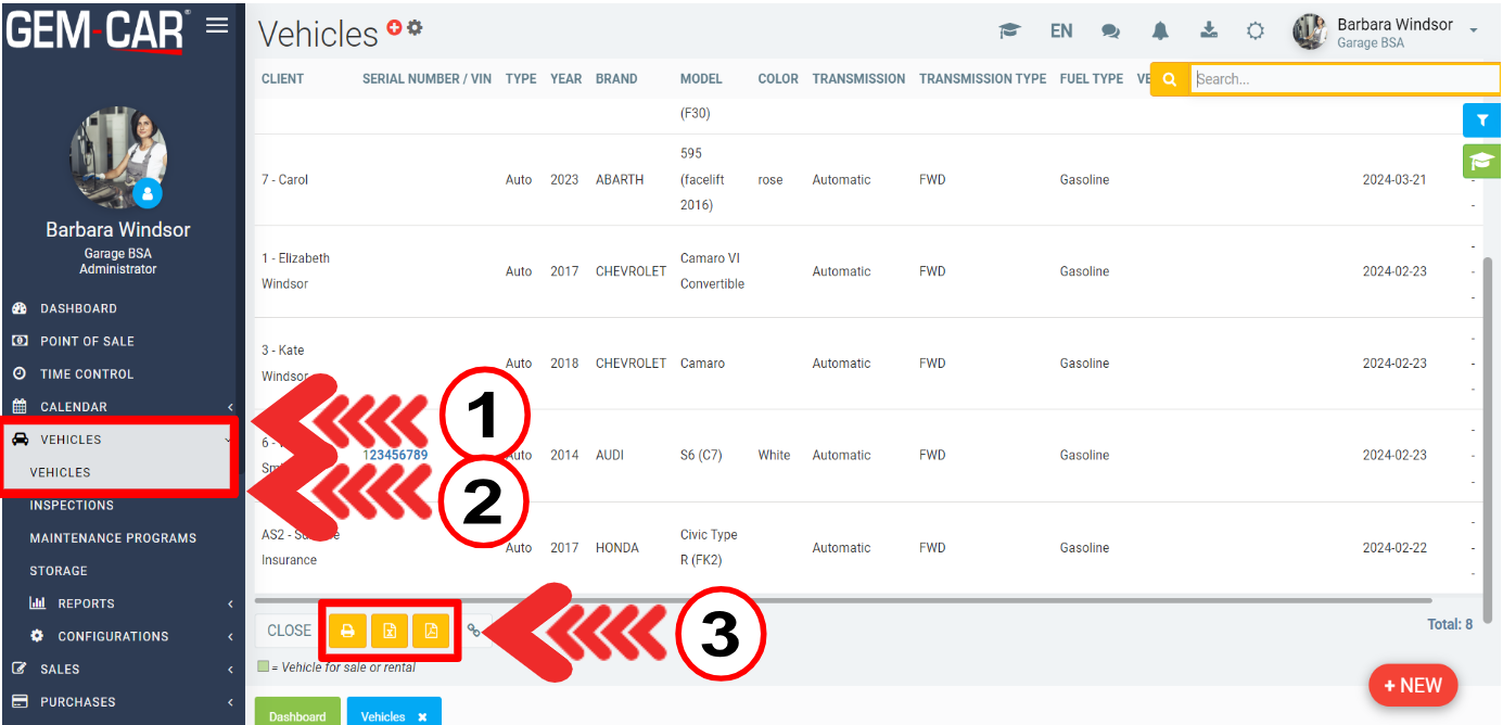 To generate a list of clients and their vehicles, click on Vehicles > Vehicles. Scroll to the end of the list.