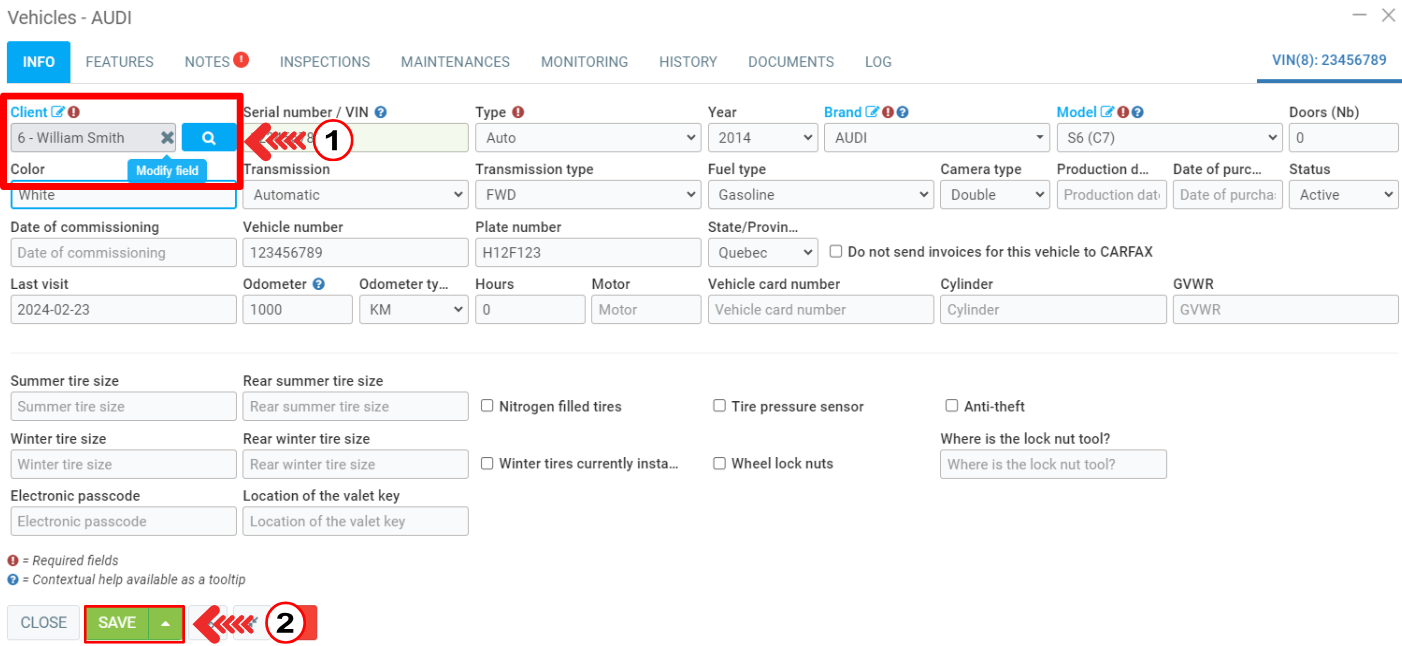 All vehicle information will be transferred to the new customer. For example, the Notes tab will show if the vehicle has any other information.