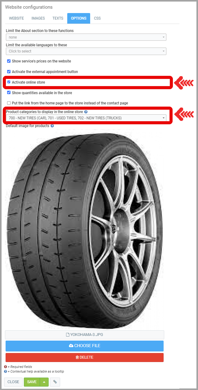 - Choose the Product categories to display in the online store. The store can be used ONLY for selling tires.
