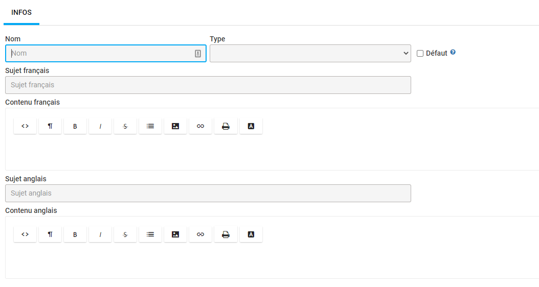 Il est possible de créer plusieurs modèles pour le même type d'envoi, dans ce cas-ci, lors de l'envoi de courriels, vous pourrez choisir celui que vous désirez utiliser. Si un modèle du type d'envoi effectué à la case Défaut de coché, celui-ci sera présélectionné.