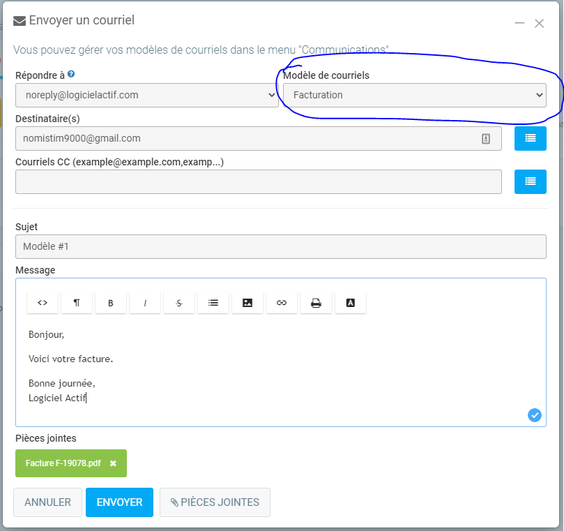 Lors d'un envoi de courriel, voici l'endroit ou vous pouvez sélectionner le modèle de courriel que vous avez créé :