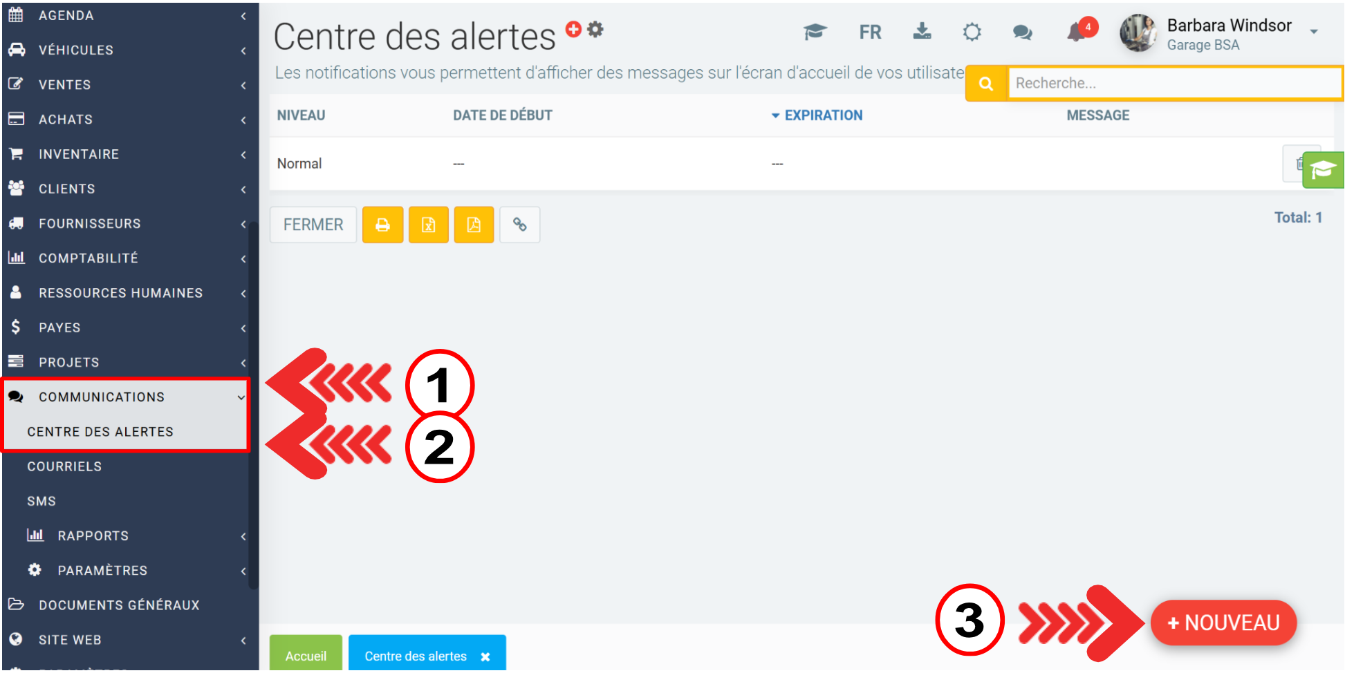 Pour créer une alerte, cliquez sur Communication > Centre des alertes > +Nouveau dans le menu de gauche.