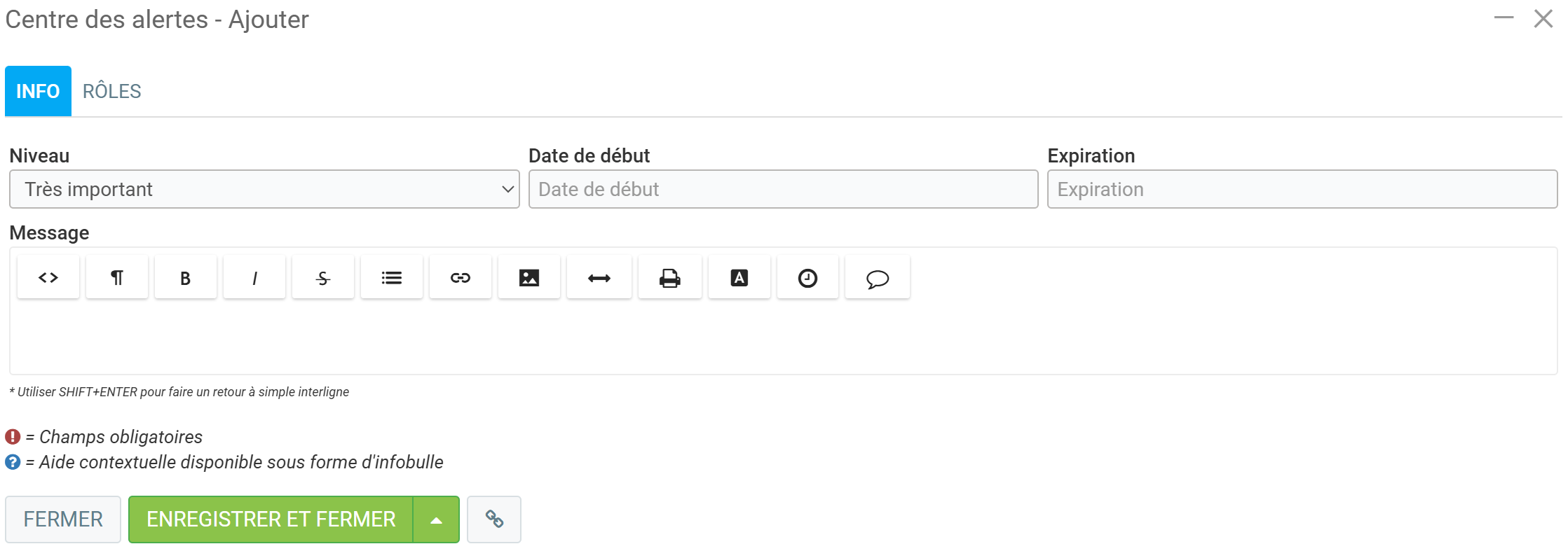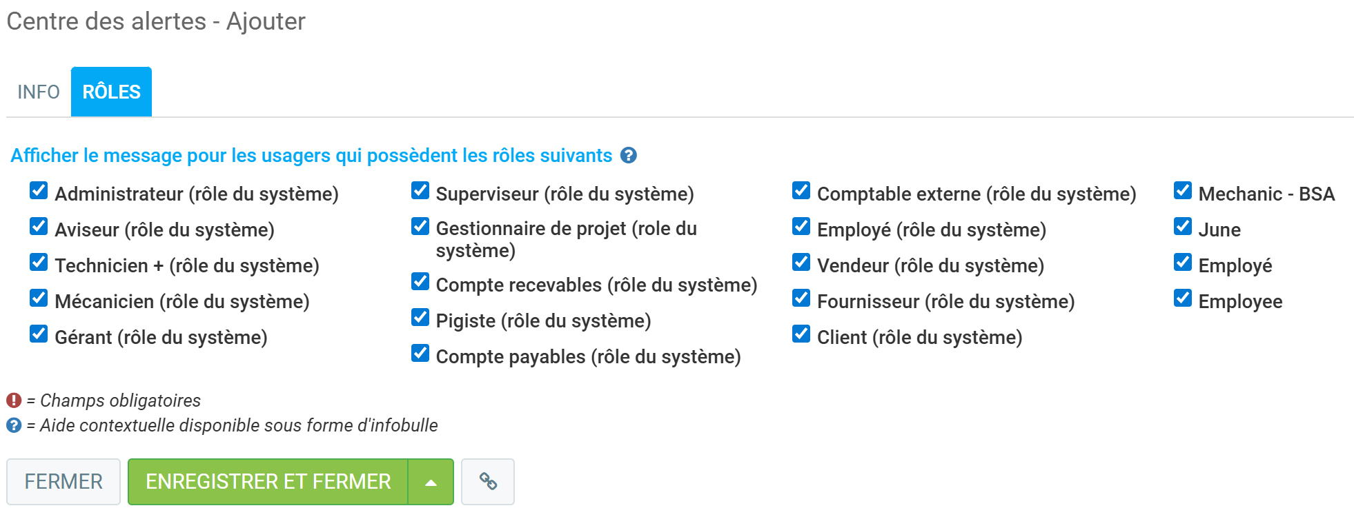 Dans l'onglet Rôles, vous devez choisir à qui s'adresse votre alerte. Selon les cases que vous cochez, différents groupes de personnes verront votre message sur leur tableau de bord.