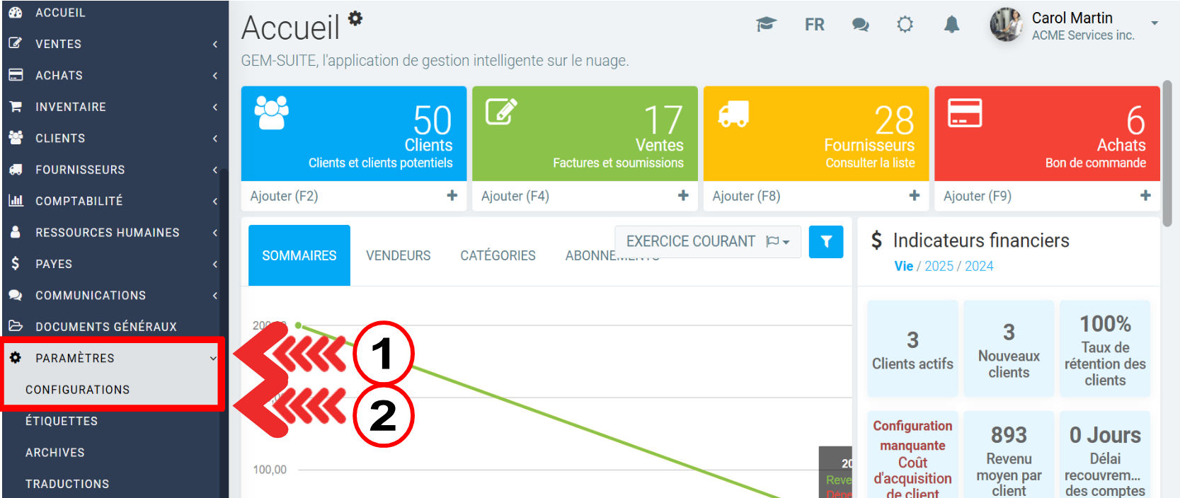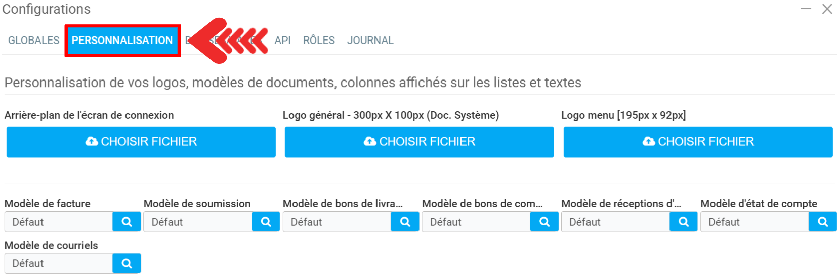 Pour configurer votre modèle de facture, vous devez passer par le menu Paramètres> Configurations.