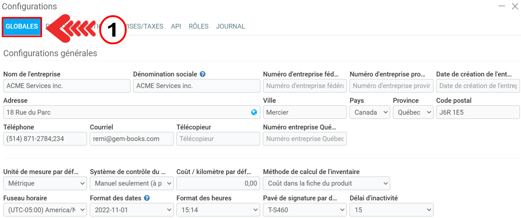 Une fois votre modèle de facture choisis, vous pouvez le personnaliser d'avantage par le menu Paramètres > Configurations, et ensuite dans l'onglet Globales.