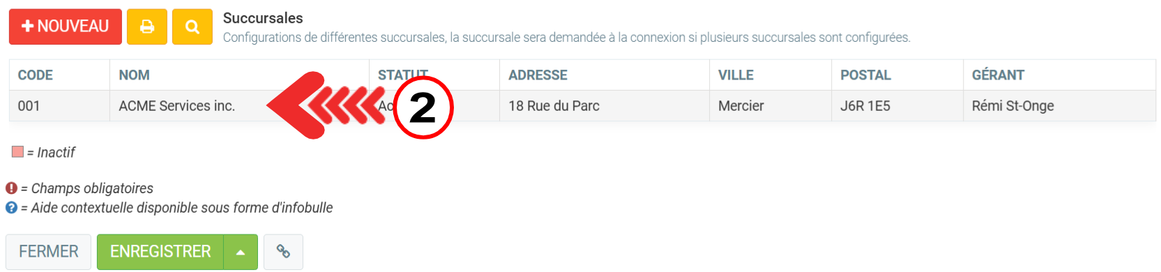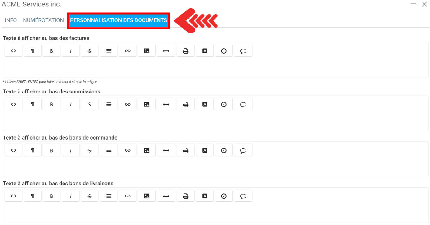 Les informations qui seront affichées sur la facture seront prise de la succursale dans l'onglet Personnalisation des documents.