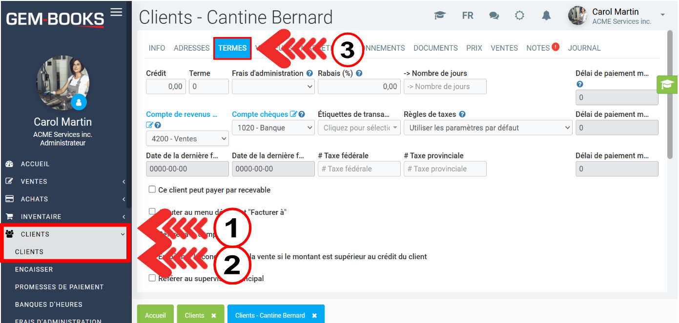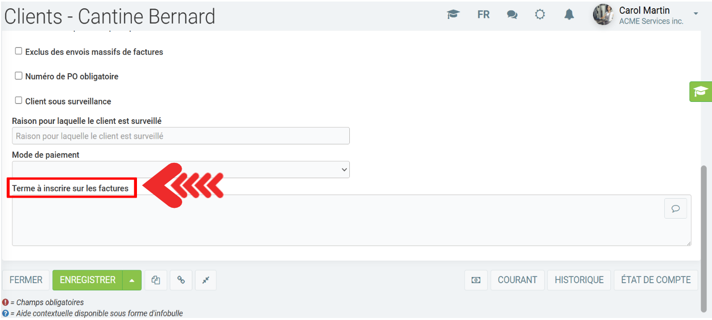 Pour les messages sur la facture, il est aussi possible d'en ajouter un spécifiquement pour un client dans le champ Terme inscrit sur la facture en cliquant sur Client > Client > l'onglet Termes.