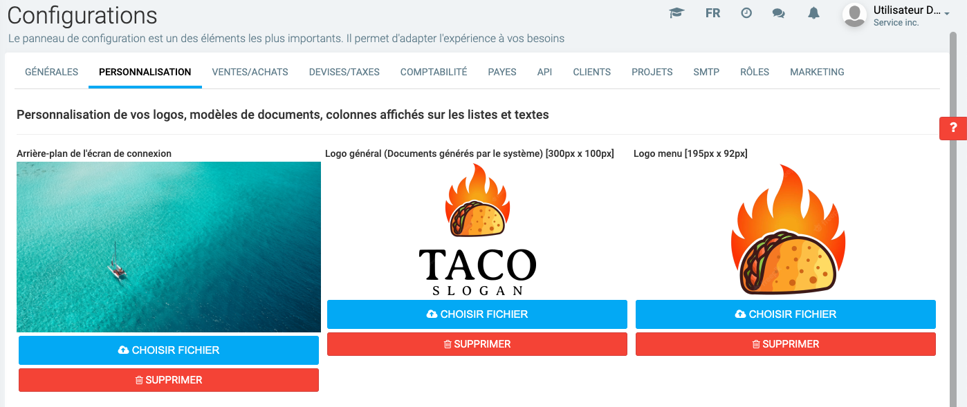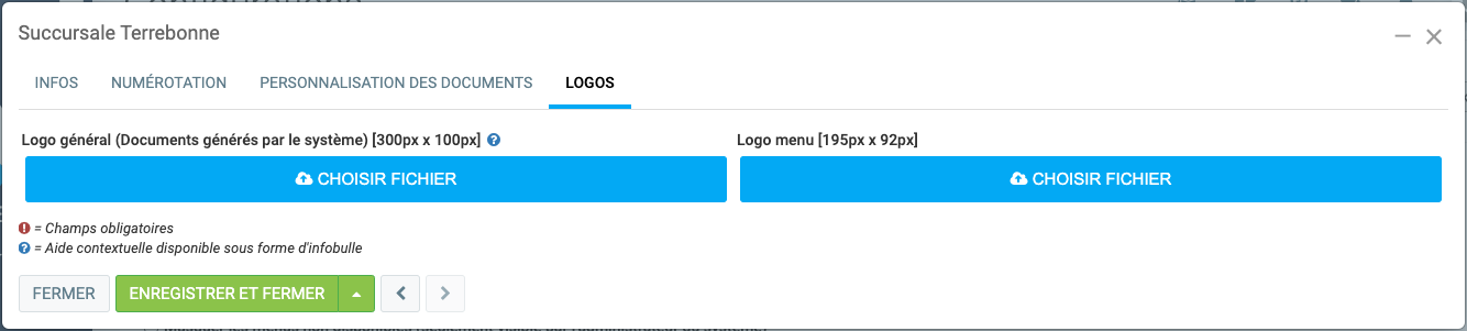 Si vous n'avez pas de succursales, rendez-vous dans le menu Paramètres, Configurations et dans l'onglet Personnalisation. Téléverser votre logo dans les sections Logo général (Documents générés par le système) [proportion suggérée 300px x 100px] et Logo menu [proportion suggérée 195px x 92px]