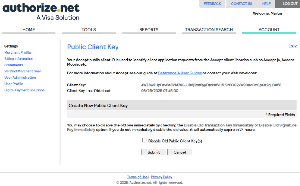 Account onglet, Manage Public Client Key pour créer ou copier le Public Client Key.