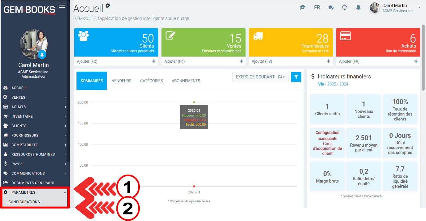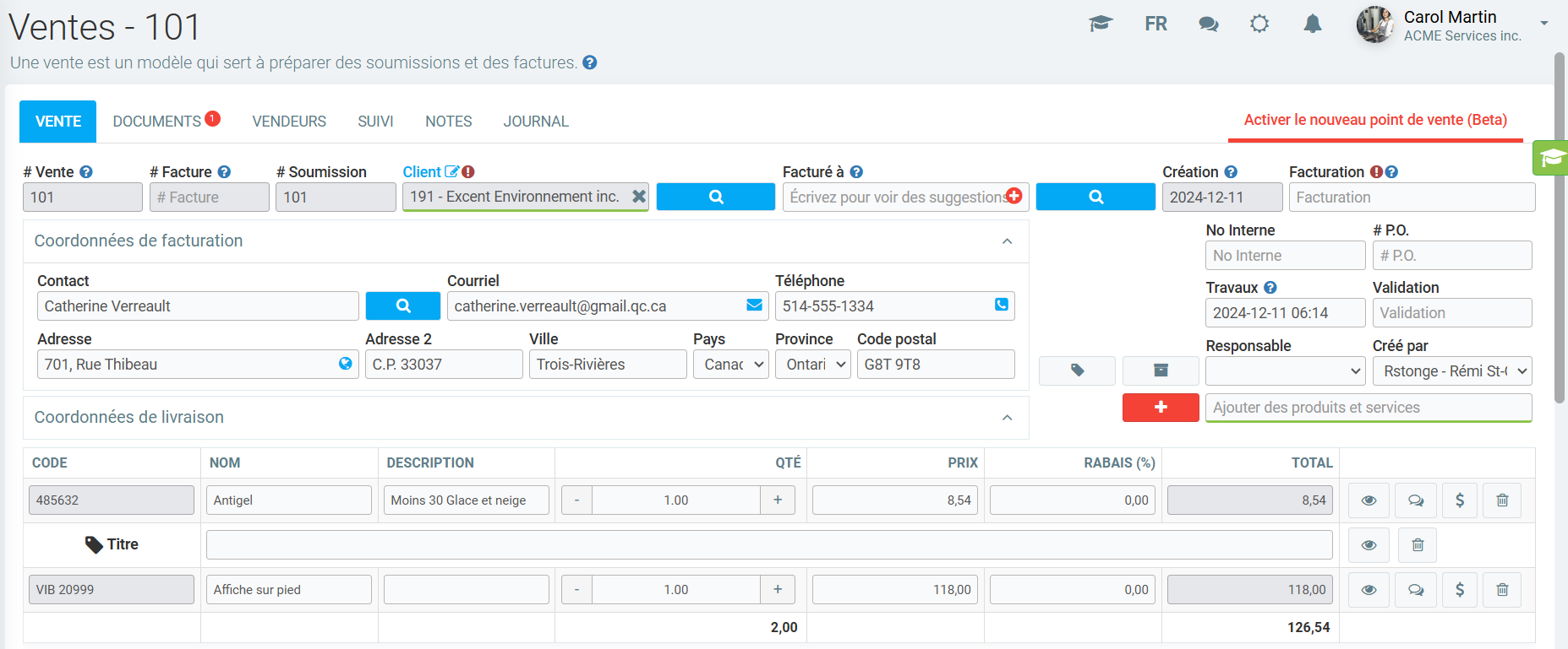 Pour vérifier la configuration, cliquez sur Ventes > Ventes et rendez-vous sur une vente facturée.