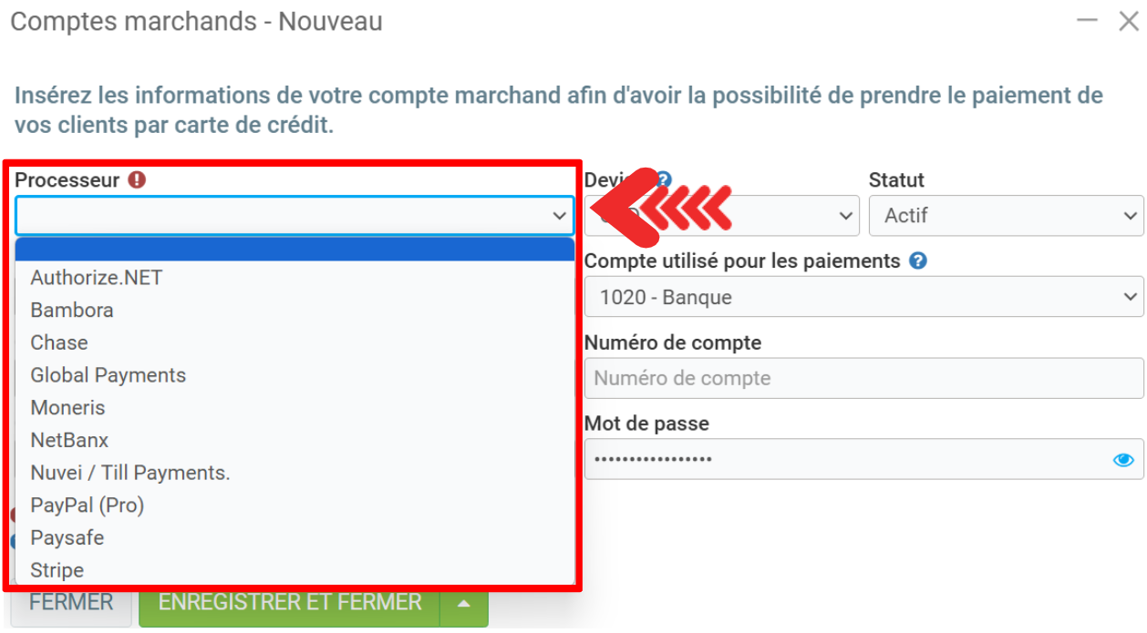 Choisissez votre processeur de paiement parmi ceux disponibles.