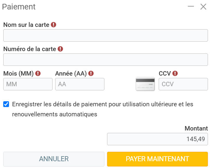 Lorsque vous cliquez sur CC, un formulaire apparaîtra afin de vous permettre d'y indiquer les informations de la carte de crédit. Notez que si vous cochez la case "Enregistrer les détails de paiement pour utilisation ultérieure et les renouvellements automatiques", les informations seront enregistrées dans la fiche du client et seront disponibles pour les prochains paiements. (Indisponible pour les comptes PayPal).