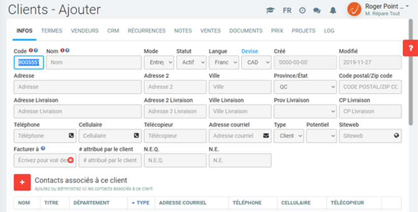 Vous pouvez alterner entre le mode Entreprise et Particulier. La différence majeure entre les deux est que l'entreprise peut, par exemple, avoir des contacts, tandis que le particulier a des champs propres comme le numéro d'assurance sociale, numéro d'assurance maladie et une date de naissance.