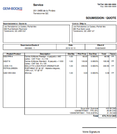 Note : Si vous avez assigné un ordre d'apparition sur soumission etfacture pour un produit ou service en particulier, GEM-CAR respectera toujours cet ordre ultérieurement.