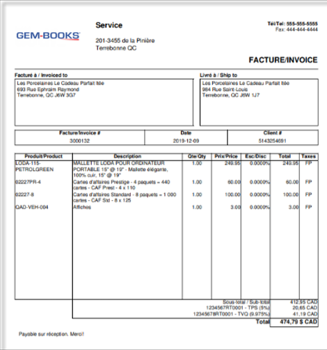 Maintenant, si nous créons la facture, voici le document qui sera généré par GEM-CAR.