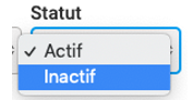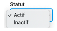 Vous pouvez maintenant modifier le statut de cette fiche et alterner entre Actif ou bien Inactif simplement en cliquant sur les flèches à droite et en modifiant la sélection. Actif vous présentera alors les 2 statuts que vous pouvez appliquer à la fiche, vous n'avez qu'à indiquer votre choix. Dans l'illustration ci-dessous, l'utilisateur verra que l'indicateur pour cette fiche est actuellement positionné sur Actif comme l'indique le crochet à la gauche du mot.