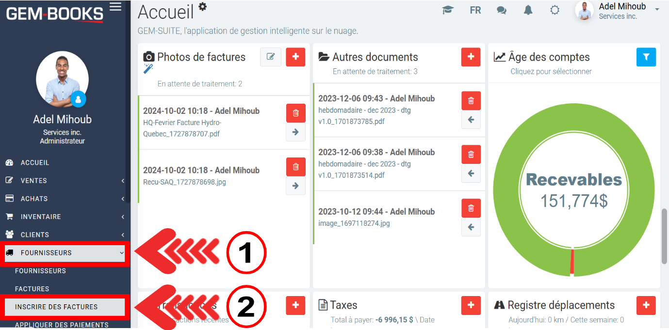 Pour transférer vos photos de factures à la comptabilité, cliquez sur l'icône du papier et du crayon en haut à droite dans la boîte du module Photos de factures sur la page d'accueil, ou cliquez sur Fournisseurs > Inscrire des factures.