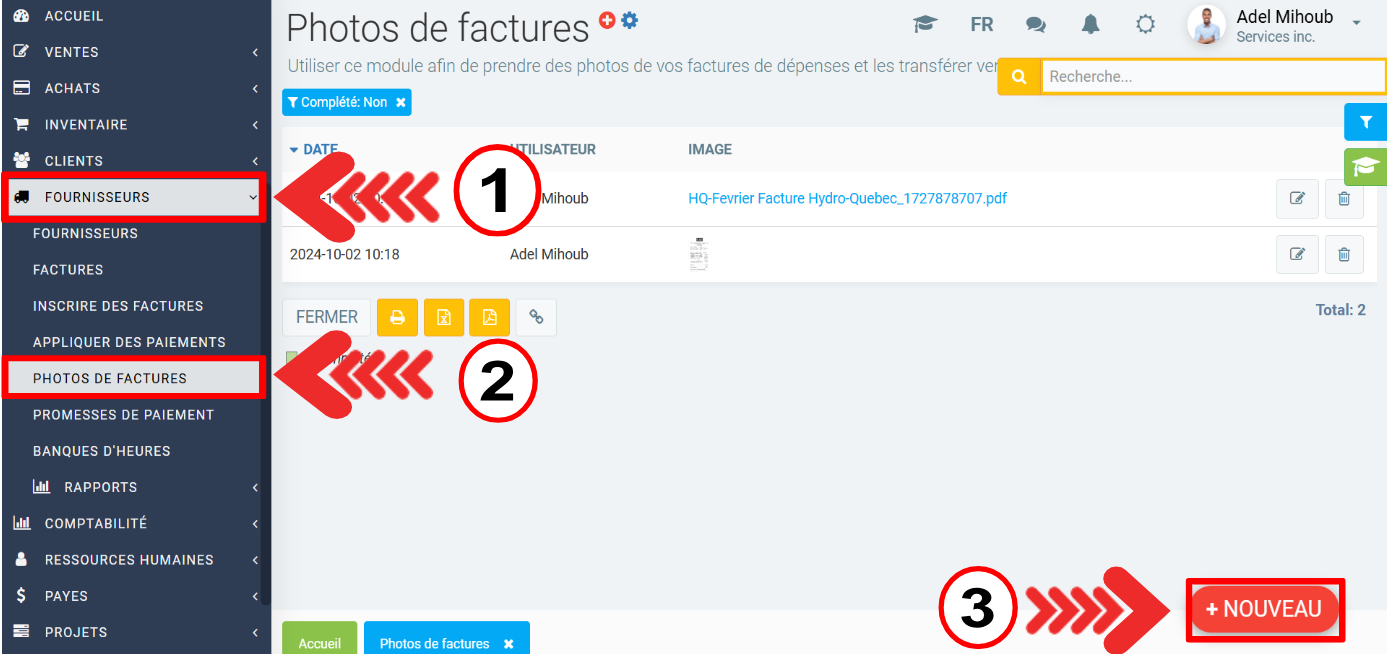 Vous pouvez également accéder au module Photos de factures en cliquant sur Fournisseurs > Photos de factures dans le menu de gauche. Pour ajouter des photos à partir de cette page, cliquez sur le bouton rouge + Nouveau.