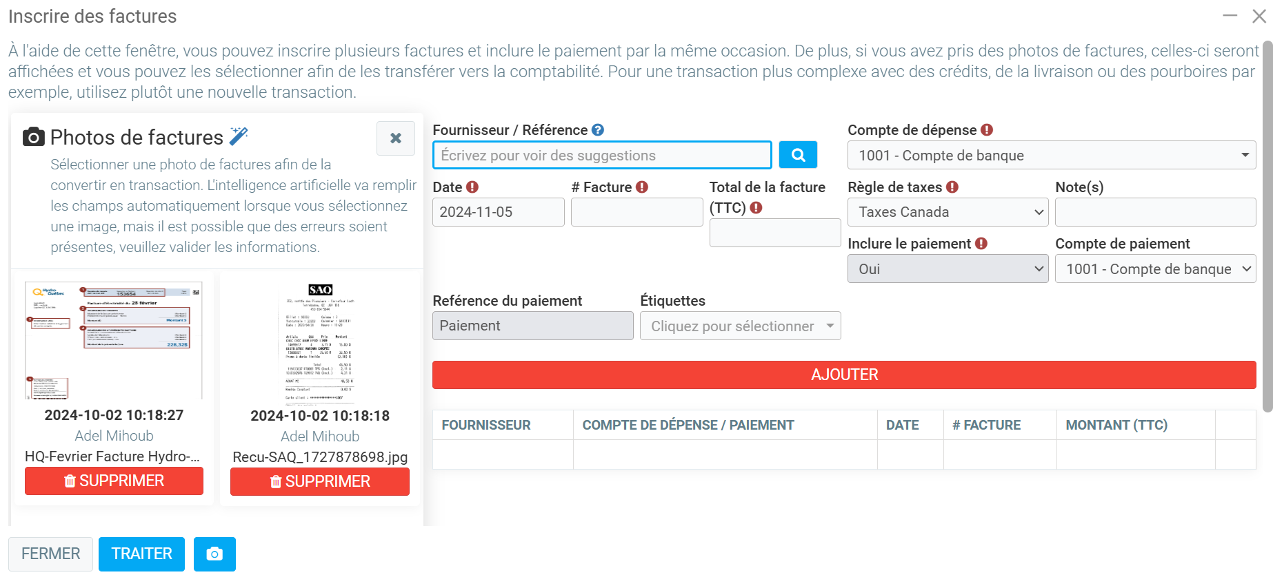 Lorsque vous avez terminé d'entrer les données des photos que vous désirez transférer à la comptabilité, cliquer sur le bouton bleu Traiter au bas de l'écran à gauche (voir photo ci-dessus). Cette action créera une transaction pour chaque facture, à partir des données que vous avez saisies. La photo originale de la facture sera attachée à la transaction pour une consultation simple et efficace.