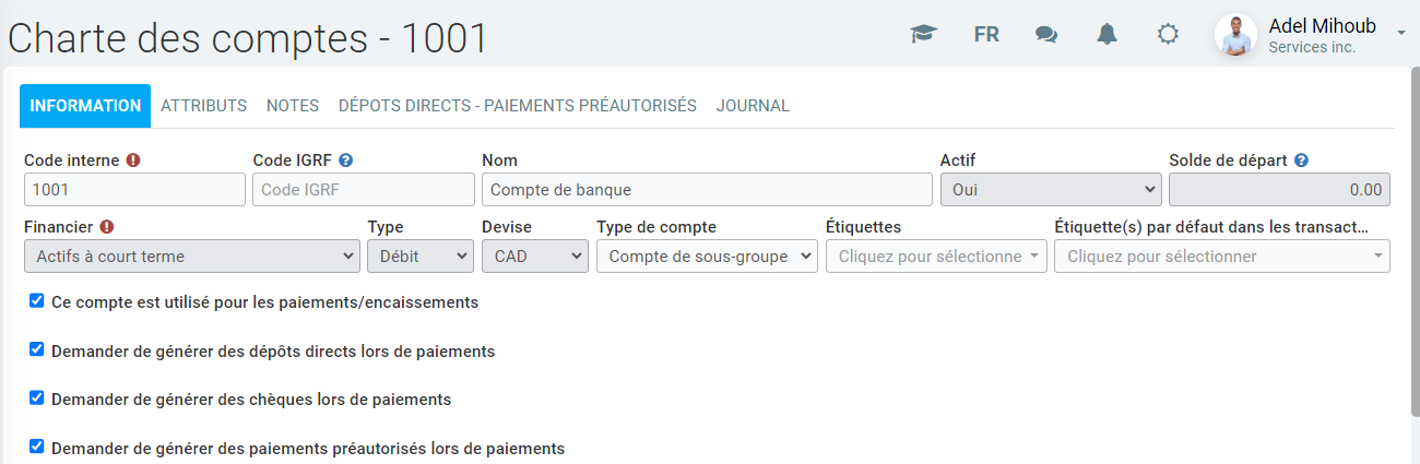 Après avoir sélectionné le compte, sous l'onglet Information, indiquez le Prochain numéro à imprimer sur les chèques.