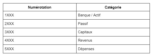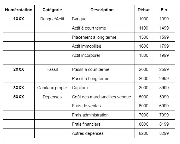 La liste des comptes qui apparaît dans les états financiers est présentée en ordre numérique croissant. On nomme « Intervalle » les valeurs entre le plus petit et le plus grand nombre d’une série de 5 chiffres.