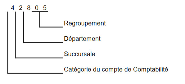 Le plan comptable à 5 chiffres est souvent choisi pour les regroupements par succursale et par département. Si le premier chiffre (ici : 4) désigne les « Ventes de biens », le deuxième chiffre identifie les ventes de biens par succursale et le troisième, par département. Très souvent, on souhaite produire un état financier par succursale, par exemple, en plus d’un état financier global.