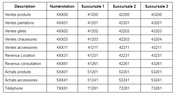 Exemple de gestion d’un plan comptable pour plusieurs succursales :Numéro à cinq chiffres du compte de comptabilité