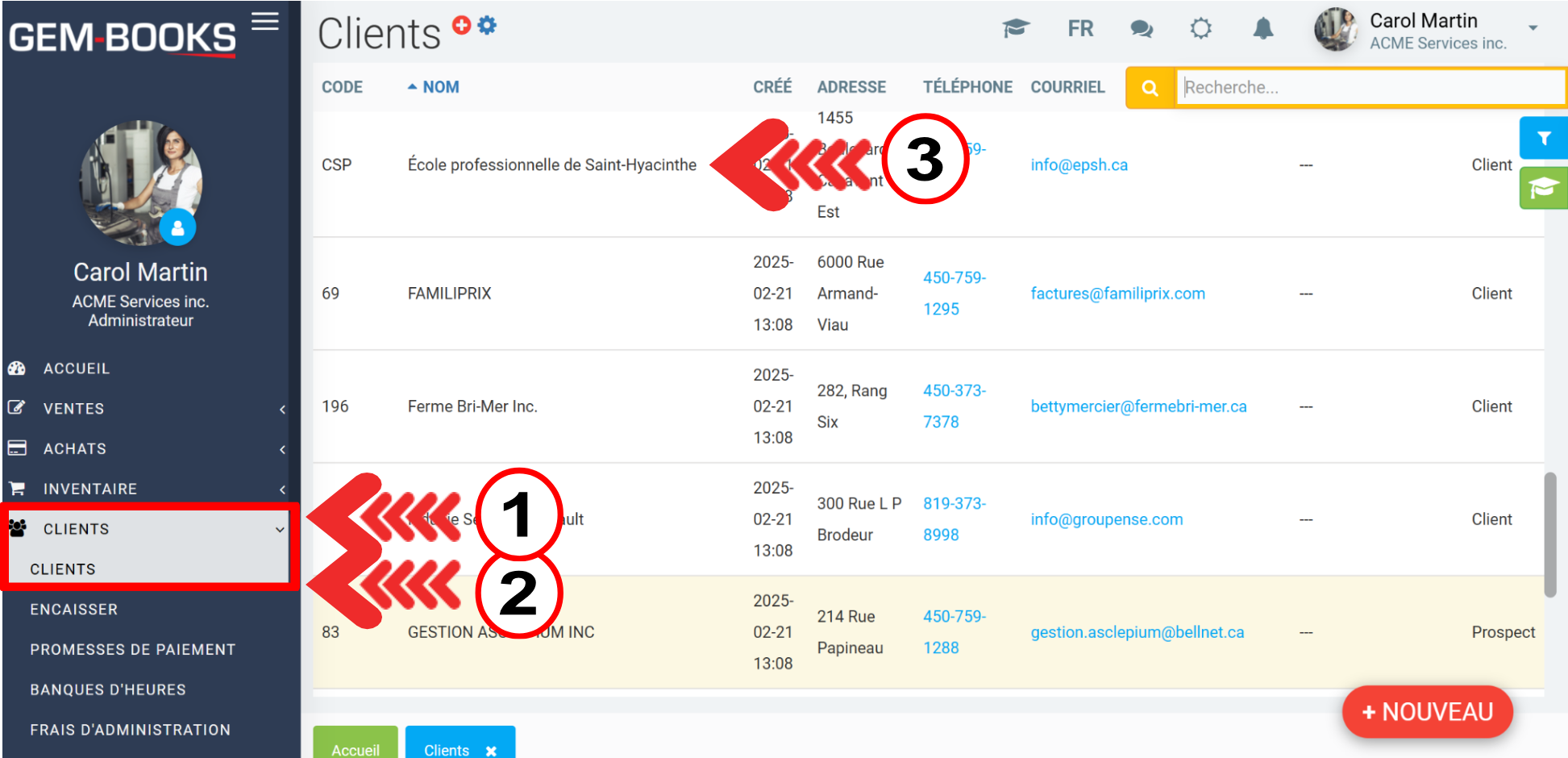 Tout d'abord, allez dans le menu de gauche, cliquez sur Clients > Clients et accédez au dossier de l'École professionnelle de Saint-Hyacinthe.