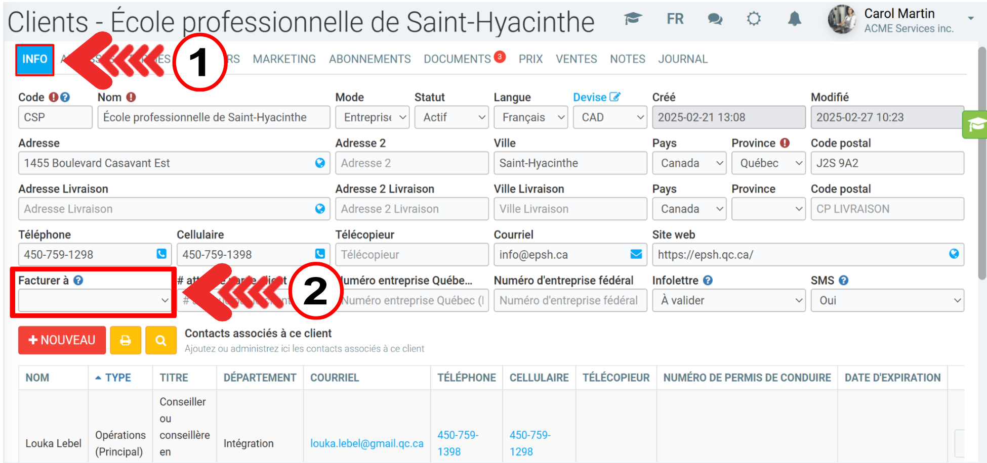 Sur sa fiche, dans l'onglet Info, aurait dans le champ "Facturé à" le nom de sa commission scolaire soit le Centre de services scolaire de Saint-Hyacinthe.